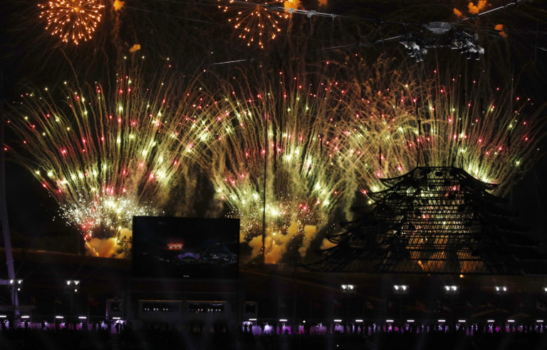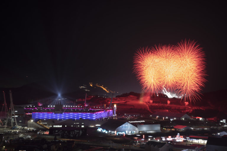 Ohňostroj počas záverečného ceremoniálu ZOH 2018. Pjongčang, 25. február 2018. Foto: Christof Stache/Pool Photo via AP.