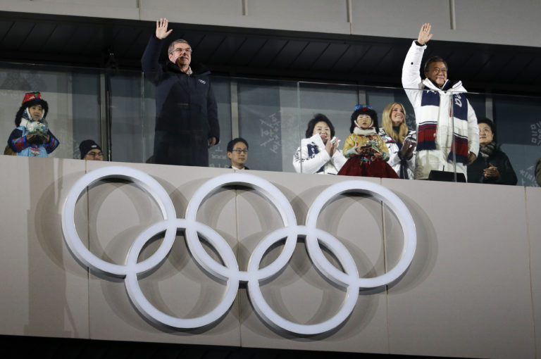 Juhokórejský prezident Mun Čä-in a šéf Medzinárodného olympijského výboru (MOV) Thomas Bach počas záverečného ceremoniálu ZOH 2018. Pjongčang, 25. február 2018. Foto: SITA/AP.