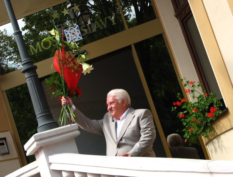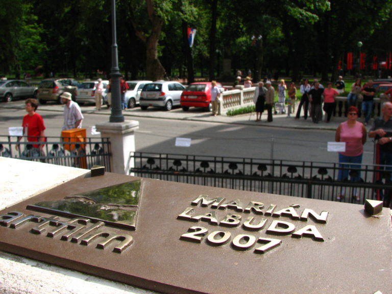 Slovenský herec Marián Labuda si dnes na Moste slávy v Trenčianskych Tepliciach prevzal mosadznú plaketu Hercova misia. Na Moste slávy tak počas jubilejného 15. Medzinárodného filmového festivalu Artfilm pribudla už tretia tabuľka, avšak prvá s mužským menom. Trenčianské Teplice, 30. jún 2007. Foto: SITA/Richard Nemec.