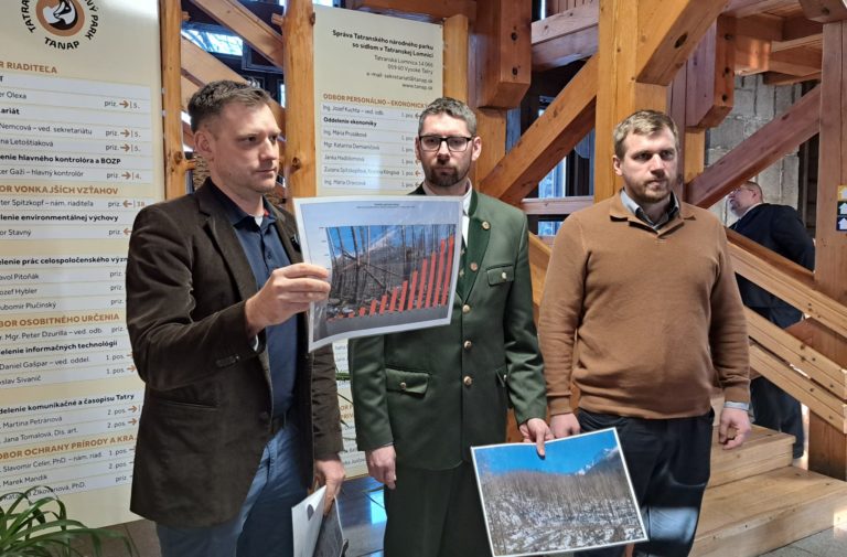 Zľava minister životného prostredia Tomáš Taraba s grafom znázorňujúcim manažment kalamity na území Tatranského národného parku, riaditeľ Správy TANAPu Peter Olexa a štátny tajomník Ministerstva životného prostredia SR Filip Kuffa pred tlačovým brífingom k zonácii Tatranského národného parku (TANAP) v sídle Správy Tatranského národného parku v Tatranskej Lomnici. Tatranská Lomnica, 9. január 2023. Foto: SITA/Mária Frisová.