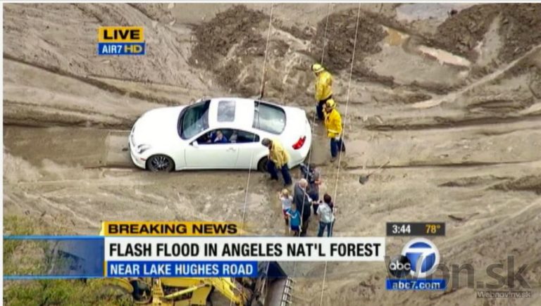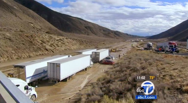 Desiatky áut uviazli v bahne na kalifornskej diaľnici Interstate 5, spájajúcej sever a juh štátu, po silných dažďoch, ktoré vyvolali zosuvy pôdy. Búrky s prívalovým dažďom a krúpami o veľkosti golfových loptičiek obyvateľov suchom sužovanej oblasti prekvapili. Náhle záplavy v oblasti jazier Lake Hughes a Elizabeth Lake premenili cesty na dravé rieky po tom, ako počas 30 minút spadlo takmer 76 milimetrov dažďových zrážok v oblasti vzdialenej 30 kilometrov na východ od diaľničného zosuvu.
