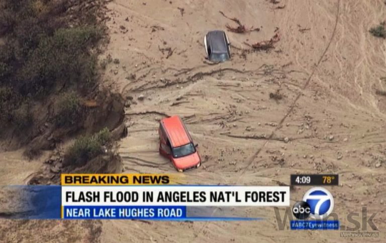 Desiatky áut uviazli v bahne na kalifornskej diaľnici Interstate 5, spájajúcej sever a juh štátu, po silných dažďoch, ktoré vyvolali zosuvy pôdy. Búrky s prívalovým dažďom a krúpami o veľkosti golfových loptičiek obyvateľov suchom sužovanej oblasti prekvapili. Náhle záplavy v oblasti jazier Lake Hughes a Elizabeth Lake premenili cesty na dravé rieky po tom, ako počas 30 minút spadlo takmer 76 milimetrov dažďových zrážok v oblasti vzdialenej 30 kilometrov na východ od diaľničného zosuvu. Foto: KABC-TV via AP