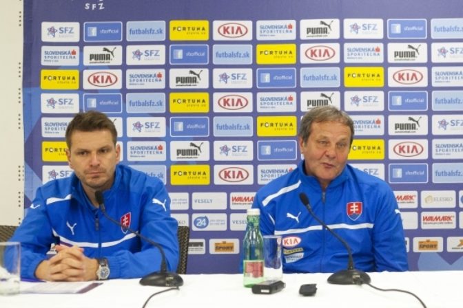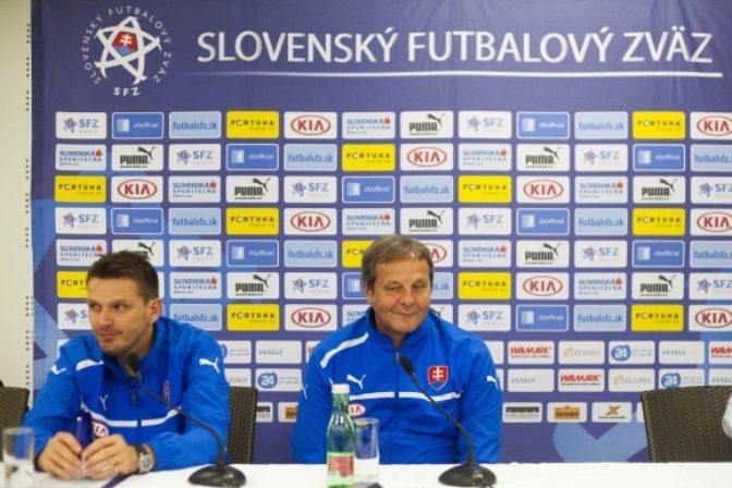 Sprava: Tréneri futbalovej reprezentácie Slovenskej republiky Ján Kozák a Štefan Tarkovič počas tlačovej besedy s trénermi futbalovej reprezentácie SR pred záverečnými dvoma stretnutiami kvalifikácie MS 2014 v Grécku a Lotyšsku. Senec, 7. október 2013. Foto: SITA/Tomáš Bokor
