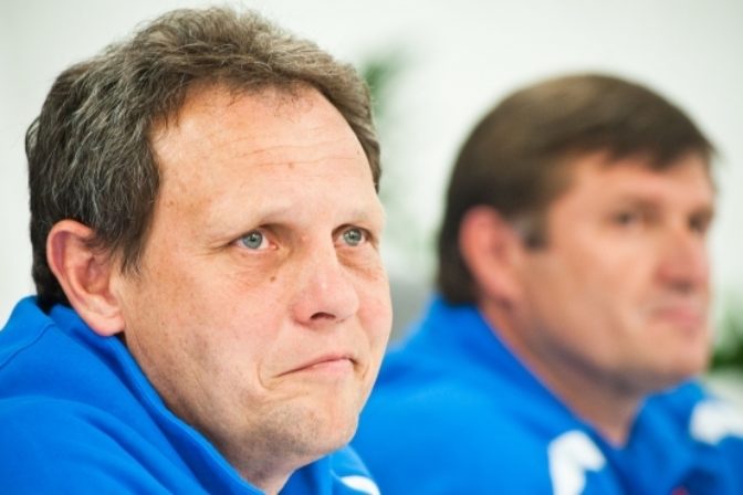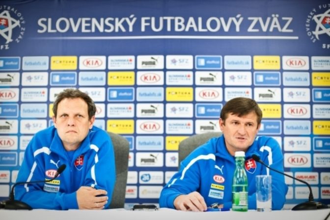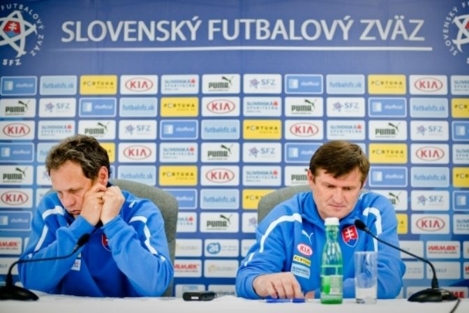 Tréner A-tímu Ján Kozák (vpravo) a jeho asistent Štefan Tarkovič počas tlačovej konferencie na zraze slovenskej futbalovej reprezentácie pred medzištátnym prípravným zápasom v Izraeli. Senec, 2. marec 2014. Foto: SITA/Ján Slovák