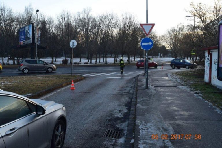 Jedno ťažké zranenie si vyžiadala zrážka troch áut, ktorá sa stala krátko pred 08:00 na križovatke Drieňovej a Herlianskej v bratislavskom Ružinove. Dvadsaťštyriročný vodič vozidla Hyundai Tuscon brzdil pred hranicou križovatky, na zľadovatenej ceste zrejme dostal šmyk a vošiel do križovatky, kde sa zrazil s Hyundai i10. Hyundai Tuscon odhodilo do stĺpa verejného osvetlenia a Hyundai i10 do protismeru, kde sa čelne zrazil s Fabiou. Dvadsaťdeväťročného vodiča Hyundai i10 s ťažkými zraneniami previezli do nemocnice. Bratislava, 5. február 2017.