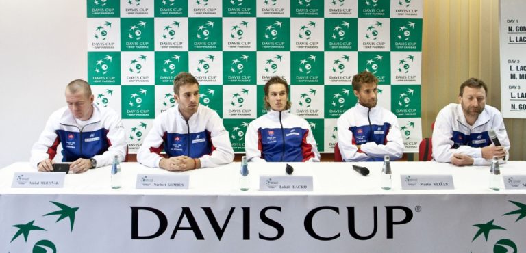 Zľava: Slovenskí tenisti Michal Mertiňák, Norbert Gombos, Lukáš Lacko, Martin Kližan a nehrajúci kapitán Slovákov Miloslav Mečíř počas TB k žrebu stretnutia 2. kola I. skupiny euroafrickej zóny Davisovho pohára Slovensko - Rakúsko. Bratislava, 3. apríl 2014. Foto: SITA/Gabriel Kuchta