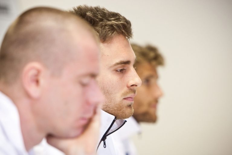Slovenský tenista Norbert Gombos (uprostred) počas TB k žrebu stretnutia 2. kola I. skupiny euroafrickej zóny Davisovho pohára Slovensko - Rakúsko. Bratislava, 3. apríl 2014. Foto: SITA/Gabriel Kuchta