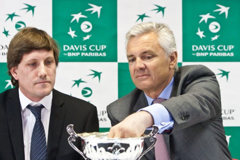 Nehrajúci kapitán Slovákov Miloslav Mečíř (vpravo) počas TB k žrebu stretnutia 2. kola I. skupiny euroafrickej zóny Davisovho pohára Slovensko - Rakúsko. Bratislava, 3. apríl 2014. Foto: SITA/Gabriel Kuchta