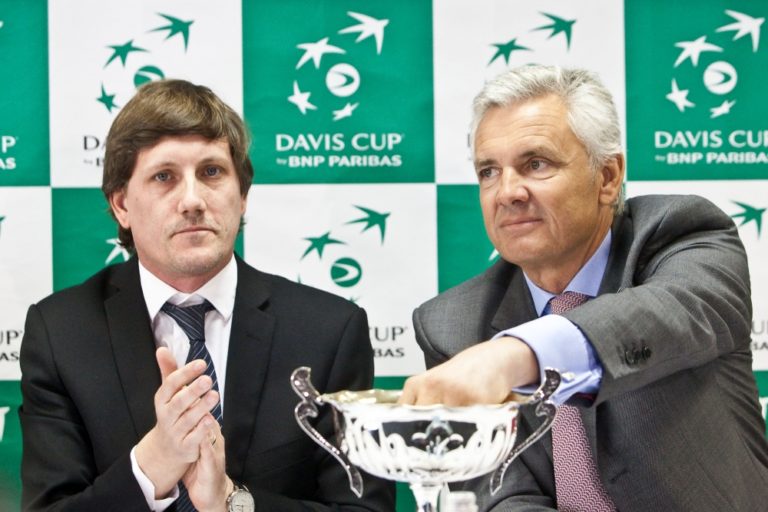 Zľava: Hlavný rozhodca Rémy Azemar a prezident národného zväzu ÖTV Ronnie Leitgeb počas žrebu stretnutia 2. kola I. skupiny euroafrickej zóny Davisovho pohára Slovensko - Rakúsko. Bratislava, 3. apríl 2014. Foto: SITA/Gabriel Kuchta