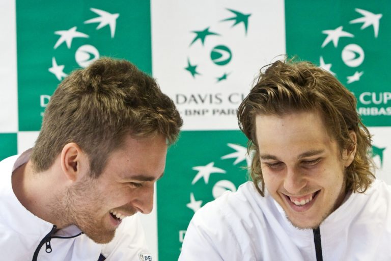 Zľava: Slovenskí tenisti Norbert Gombos a Lukáš Lacko počas TB k žrebu stretnutia 2. kola I. skupiny euroafrickej zóny Davisovho pohára Slovensko - Rakúsko. Bratislava, 3. apríl 2014. Foto: SITA/Gabriel Kuchta