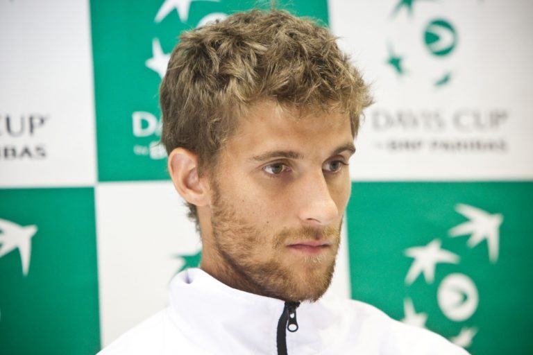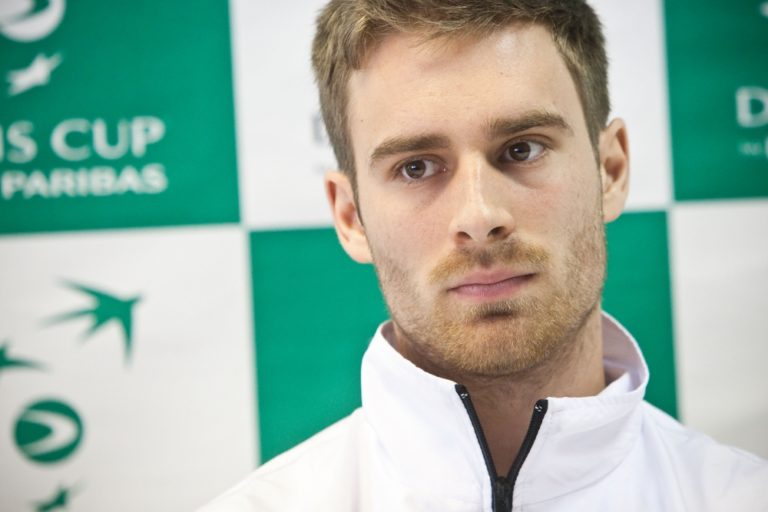 Slovenský tenista Norbert Gombos počas TB k žrebu stretnutia 2. kola I. skupiny euroafrickej zóny Davisovho pohára Slovensko - Rakúsko. Bratislava, 3. apríl 2014. Foto: SITA/Gabriel Kuchta
