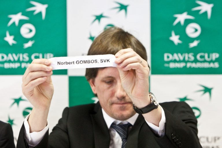 Hlavný rozhodca Rémy Azemar počas žrebu stretnutia 2. kola I. skupiny euroafrickej zóny Davisovho pohára Slovensko - Rakúsko. Bratislava, 3. apríl 2014. Foto: SITA/Gabriel Kuchta