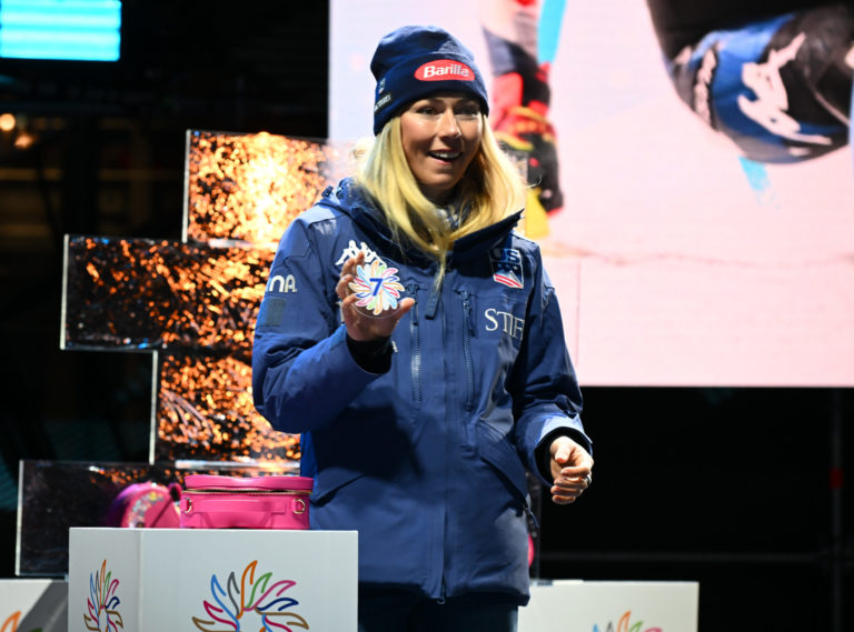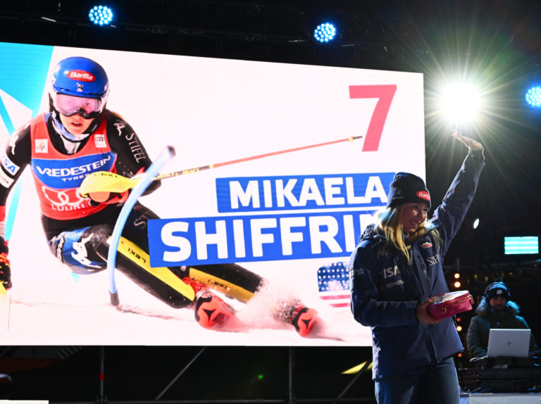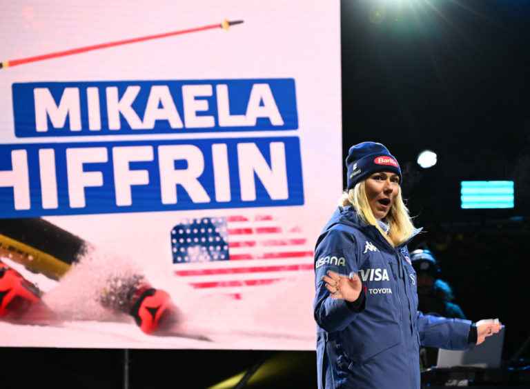 Americká lyžiarka Mikaela Shiffrinová počas verejného žrebovania čísel na preteky obrovského slalomu žien v rámci Svetového pohára v alpskom lyžovaní v lyžiarskom stredisku Jasná v Demänovskej doline. Demänovská Dolina, 19. január 2024. Foto: SITA/Martin Medňanský
