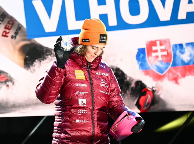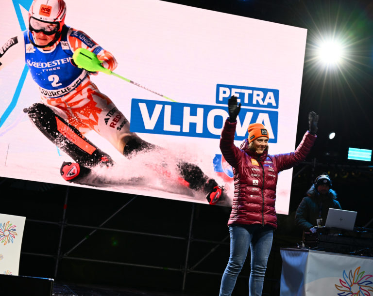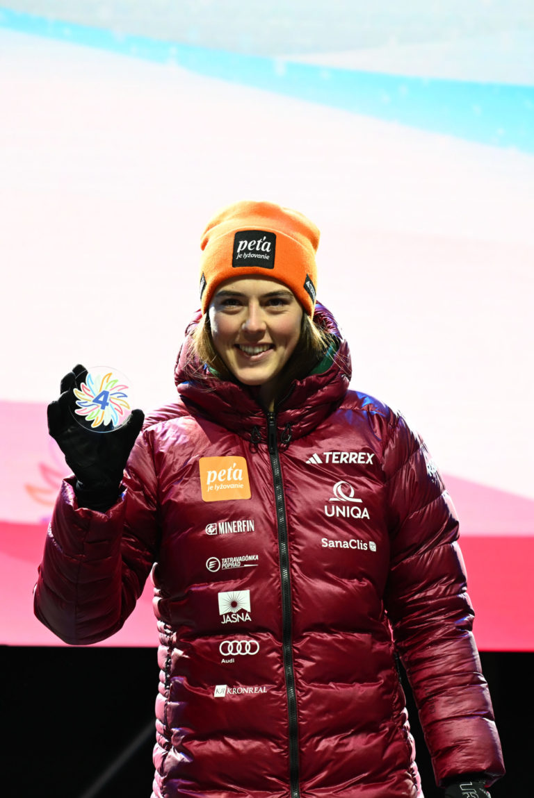 Slovenská lyžiarka Petra Vlhová počas verejného žrebovania čísel na preteky obrovského slalomu žien v rámci Svetového pohára v alpskom lyžovaní v lyžiarskom stredisku Jasná v Demänovskej doline. Demänovská Dolina, 19. január 2024. Foto: SITA/Martin Medňanský