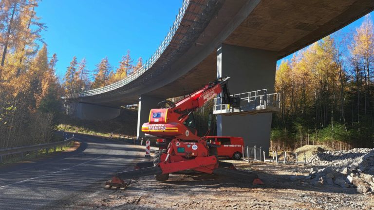 Vozidlo slúžiace na práce v súvislosti s rekonštrukciou mosta pri Vyšných Hágoch v rámci modernizácie Cesty slobody vo Vysokých Tatrách. Vysoké Tatry, 8. november 2023. Foto: SITA/Mária Frisová