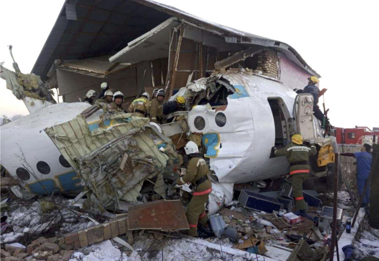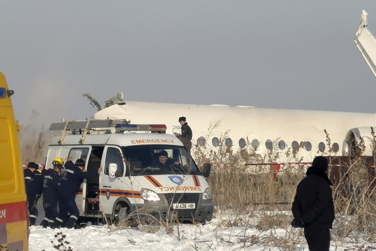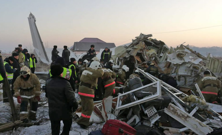 Na medzinárodnom letisku v kazašskom meste Almaty sa zrútilo lietadlo. Stroj sa zrútil krátko po vzlietnutí, vrazil do betónového plota a dvojposchodovej budovy. Foto: SITA/AP