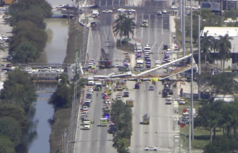 10. marca 2018 v ranných hodinách inštalovali nový nadchod pre chodcov, ktorý mal spojiť floridskú univerzitu a mesto Sweetwater. Nadchod vážiaci 950 ton však nevydržal a zrútil sa. Foto: SITA/AP