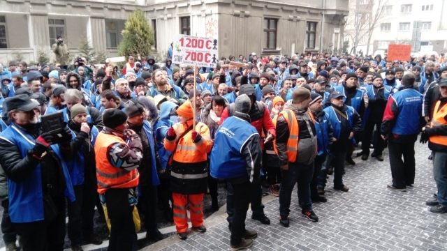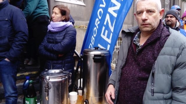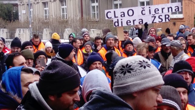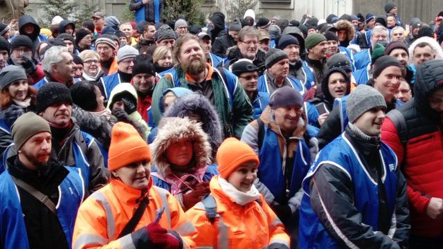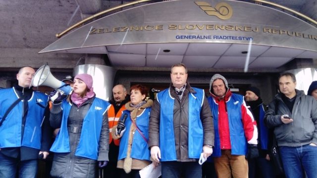 Foto: NasaDoprava.sk/Martin Benko. Odborári pred ďalším kolom vyjednávania s vedením ŽSR. Bratislava, 23. 1. 2019.