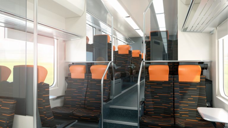 Interiér novej modernej elektrickej jednotky pre regionálnu dopravu Železničnej spoločnosti Slovensko (ZSSK) v okolí Žiliny. Vykonávacie rozhodnutie Európskej komisie (EK) schválilo finančný príspevok na veľký projekt - Modernizácia vozového parku. Nové elektrické jednotky plánuje národný dopravca nasadiť do regionálnej dopravy v Žilinskom samosprávnom kraji na tratiach Žilina – Trenčín, Horní Lideč – Púchov, Žilina – Čadca – Zwardoń a Žilina – Liptovský Mikuláš. Bratislava, 8. október 2018. Foto: SITA/ZSSK