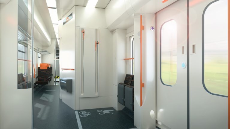 Priestor pre bicykle novej modernej elektrickej jednotky pre regionálnu dopravu Železničnej spoločnosti Slovensko (ZSSK) v okolí Žiliny. Vykonávacie rozhodnutie Európskej komisie (EK) schválilo finančný príspevok na veľký projekt - Modernizácia vozového parku. Nové elektrické jednotky plánuje národný dopravca nasadiť do regionálnej dopravy v Žilinskom samosprávnom kraji na tratiach Žilina – Trenčín, Horní Lideč – Púchov, Žilina – Čadca – Zwardoń a Žilina – Liptovský Mikuláš. Bratislava, 8. október 2018. Foto: SITA/ZSSK