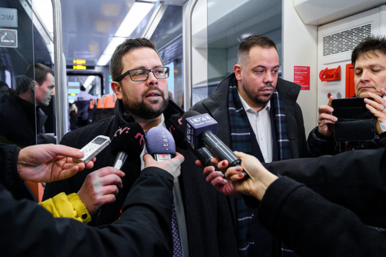 Predseda predstavenstva a generálny riaditeľ SSK Filip Hlubocký (vľavo v popredí) počas tlačovej besedy elezničnej spoločnosti Slovensko (ZSSK) na tému: predstavenie novej elektrickej jednotky. Bratislava, 6. február 2020. Foto: SITA/Milo Fabian