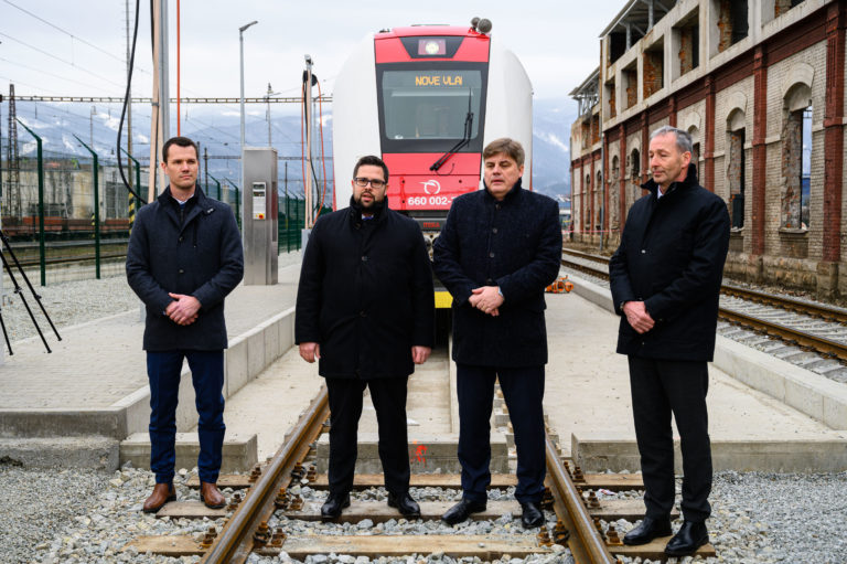 Zľava: Zástupca Ministerstva dopravy a výstavby SR odboru projektov železničnej infraštruktúry verejnej a osobnej dopravy Viktor Veselovský, predseda predstavenstva a generálny riaditeľ ZSSK Filip Hlubocký, predseda predstavenstva a Prezident skupiny koda Transportation Petr Brzezina a generálny riaditeľ OS Trnava Miloš Kyselica počas predstavenia novej elektrickej jednotky ZSSK v rušňovom depe Vrútky. Vrútky, 6. február 2020. Foto: SITA/Milo Fabian