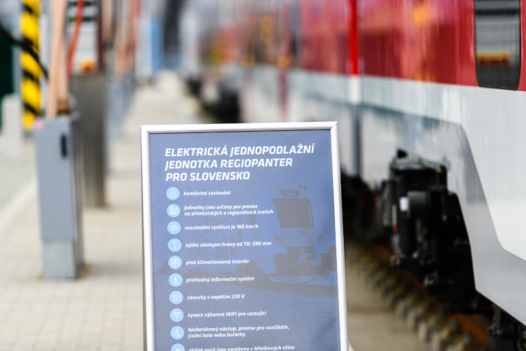 Informačná tabuľa k novej elektrickej jednotke železničnej spoločnosti Slovensko (ZSSK) počas jej predstavenia v rušňovom depe Vrútky. Vrútky, 6. február 2020. Foto: SITA/Milo Fabian