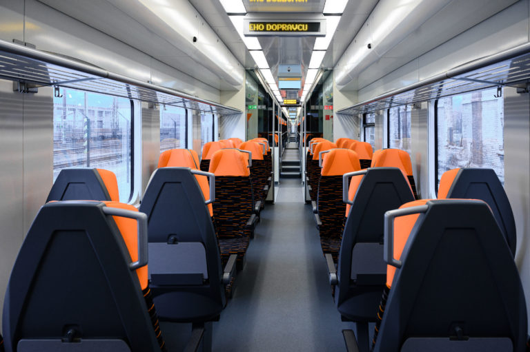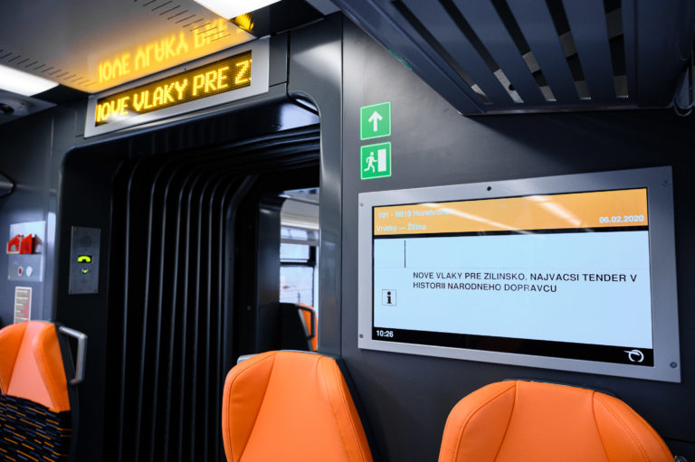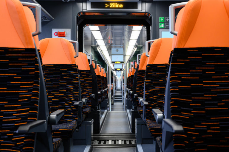 Interiér novej elektrickej jednotky železničnej spoločnosti Slovensko (ZSSK) počas jej predstavenia v rušňovom depe Vrútky. Vrútky, 6. február 2020. Foto: SITA/Milo Fabian