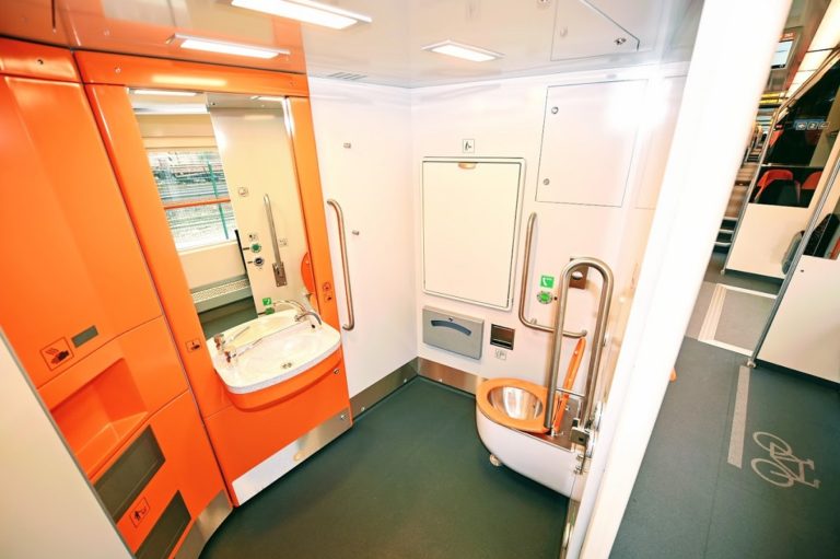 Interiér toalety novej elektrickej jednotky železničnej spoločnosti Slovensko (ZSSK) počas jej predstavenia v rušňovom depe Vrútky. Bratislava, 6. február 2020. Foto: SITA/Milo Fabian