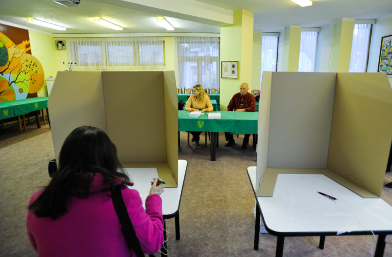 Voliči vo volebnej miestnosti v Starej Turej počas volieb poslancov a predsedov do orgánov samosprávnych krajov vyšších územných celkov (VÚC) v Trenčianskom samosprávnom kraji (TSK). Stará Turá, 4. november 2017. Foto: SITA/Martin Medňanský