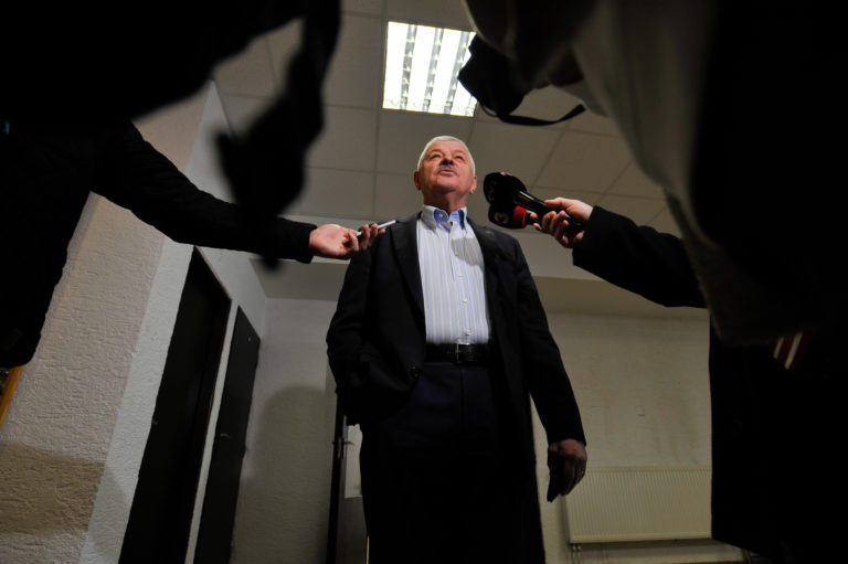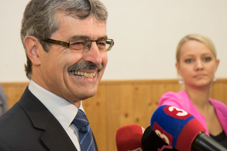 Kandidát na post predsedu BSK Milan Ftáčnik (vľavo) počas brífingu po volebnom akte volieb poslancov a predsedov do orgánov samosprávnych krajov - vyšších územných celkov (VÚC) v Bratislavskom samosprávnom kraji (BSK). Bratislava, 4. november 2017. Foto: SITA/Ľudovít Vaniher