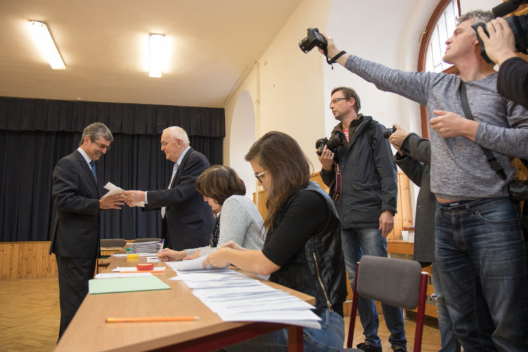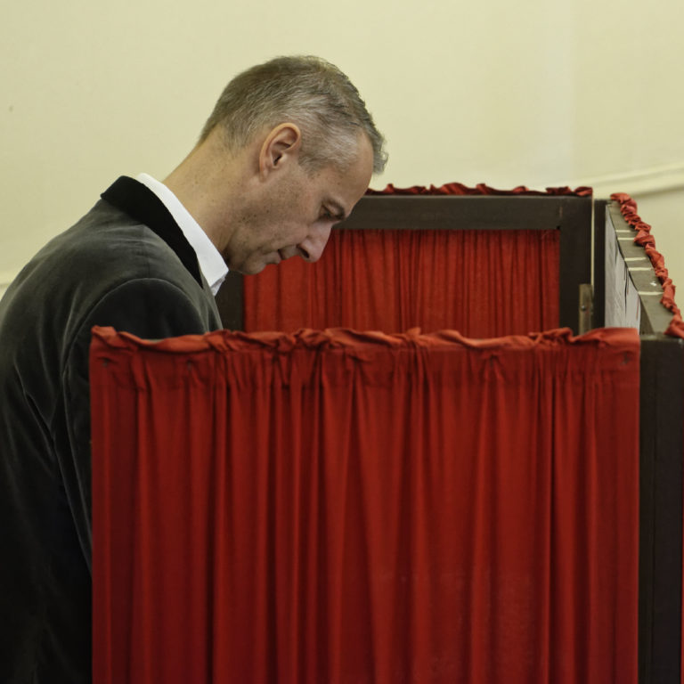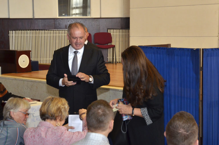 Prezident SR Andrej Kiska počas volebného aktu v rámci volieb poslancov a predsedov do orgánov samosprávnych krajov - vyšších územných celkov (VÚC) v Prešovskom samosprávnom kraji (PSK). Poprad, 4. november 2017. Foto: SITA/Radoslav Maťaš