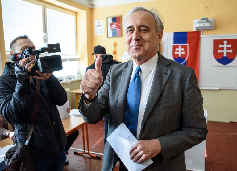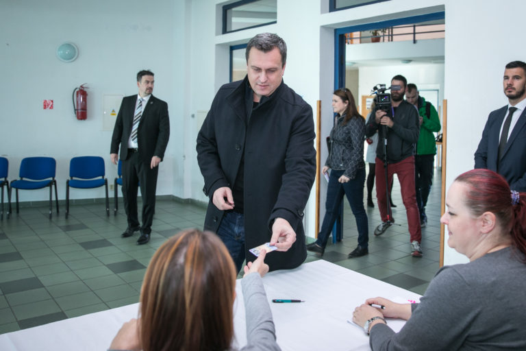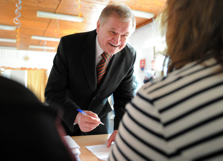 Predseda Národnej rady SR a predseda strany SNS Andrej Danko (vľavo) vo volebnej miestnosti v Miloslavove počas volieb poslancov a predsedov do orgánov samosprávnych krajov - vyšších územných celkov (VÚC) v Bratislavskom samosprávnom kraji (BSK). Miloslavov Alžbetin Dvor, 4. november 2017. Foto: SITA/Diana Černáková