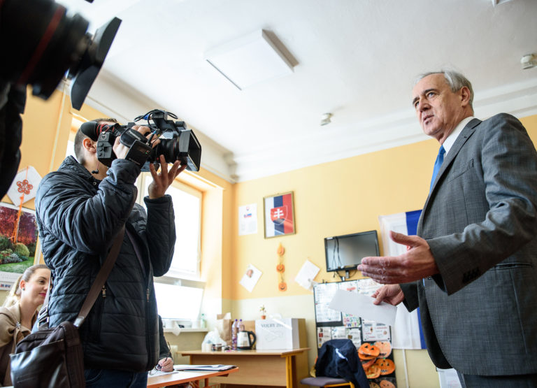 Prezident SR Andrej Kiska počas brífingu po volebnom akte počas volieb poslancov a predsedov do orgánov samosprávnych krajov - vyšších územných celkov (VÚC) v Prešovskom samosprávnom kraji (PSK). Poprad, 4. november 2017. Foto: SITA/Radoslav Maťaš