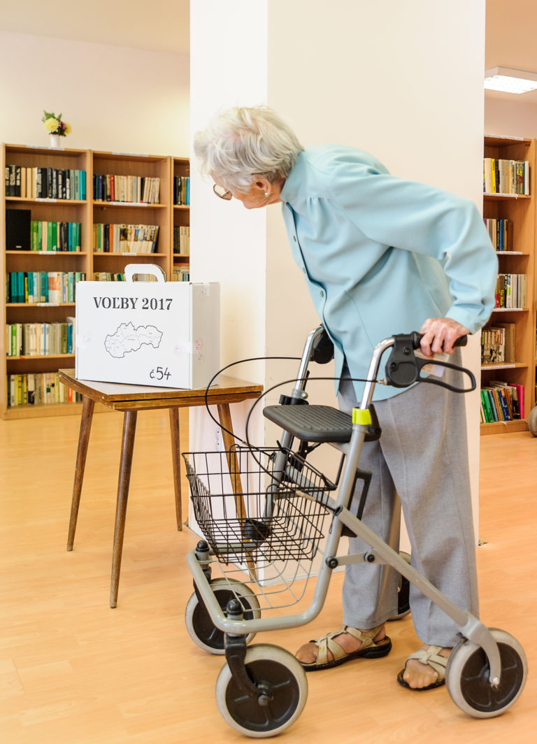 Účastníčka volieb v Zariadení pre seniorov Zobor v Nitre počas volieb poslancov a predsedov do orgánov samosprávnych krajov - vyšších územných celkov (VÚC) v Nitrianskom samosprávnom kraji (NSK). Nitra, 4. november 2017. Foto: SITA/Martin Havran