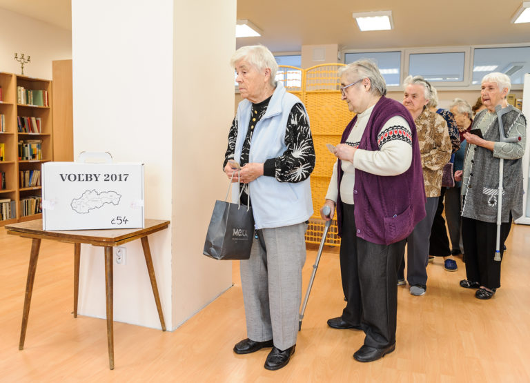 Účastníci volieb v Zariadení pre seniorov Zobor v Nitre počas volieb poslancov a predsedov do orgánov samosprávnych krajov - vyšších územných celkov (VÚC) v Nitrianskom samosprávnom kraji (NSK). Nitra, 4. november 2017. Foto: SITA/Martin Havran