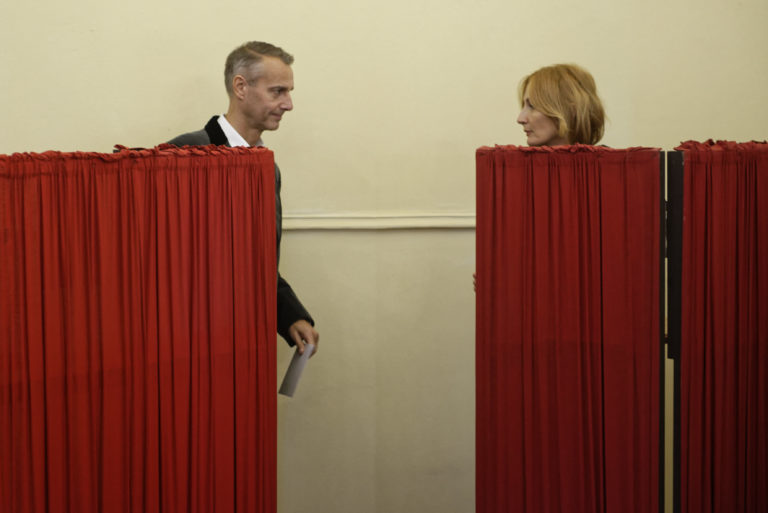 Prezident SR Andrej Kiska (vľavo) s manželkou Martinou (vpravo) počas volebného aktu počas volieb poslancov a predsedov do orgánov samosprávnych krajov - vyšších územných celkov (VÚC) v Prešovskom samosprávnom kraji (PSK). Poprad, 4. november 2017. Foto: SITA/Radoslav Maťaš