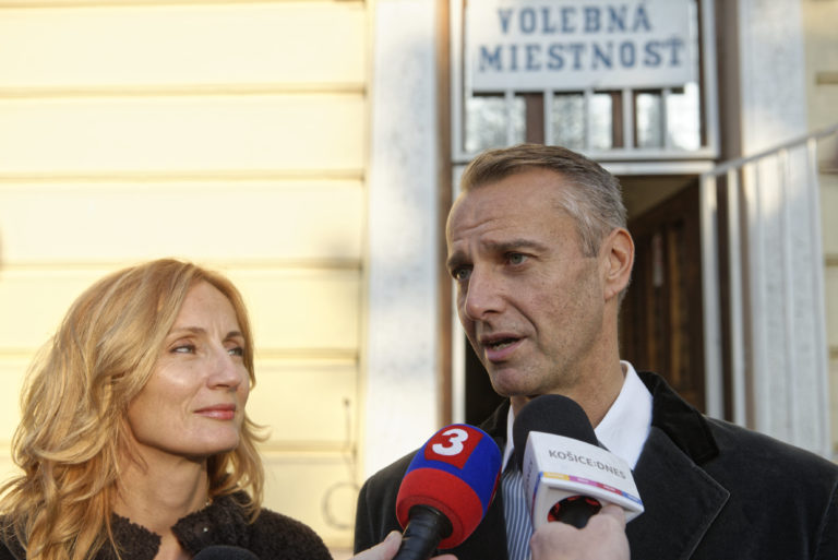 Primátor Košíc a kandidát na post predsedu Košického samosprávneho kraja (KSK) Richard Raši (vpravo) s manželkou na krátkom brífingu počas volieb poslancov a predsedov do orgánov samosprávnych krajov - vyšších územných celkov (VÚC) v KSK. Košice, 4 november 2017. Foto: SITA/Ivan Fleischer
