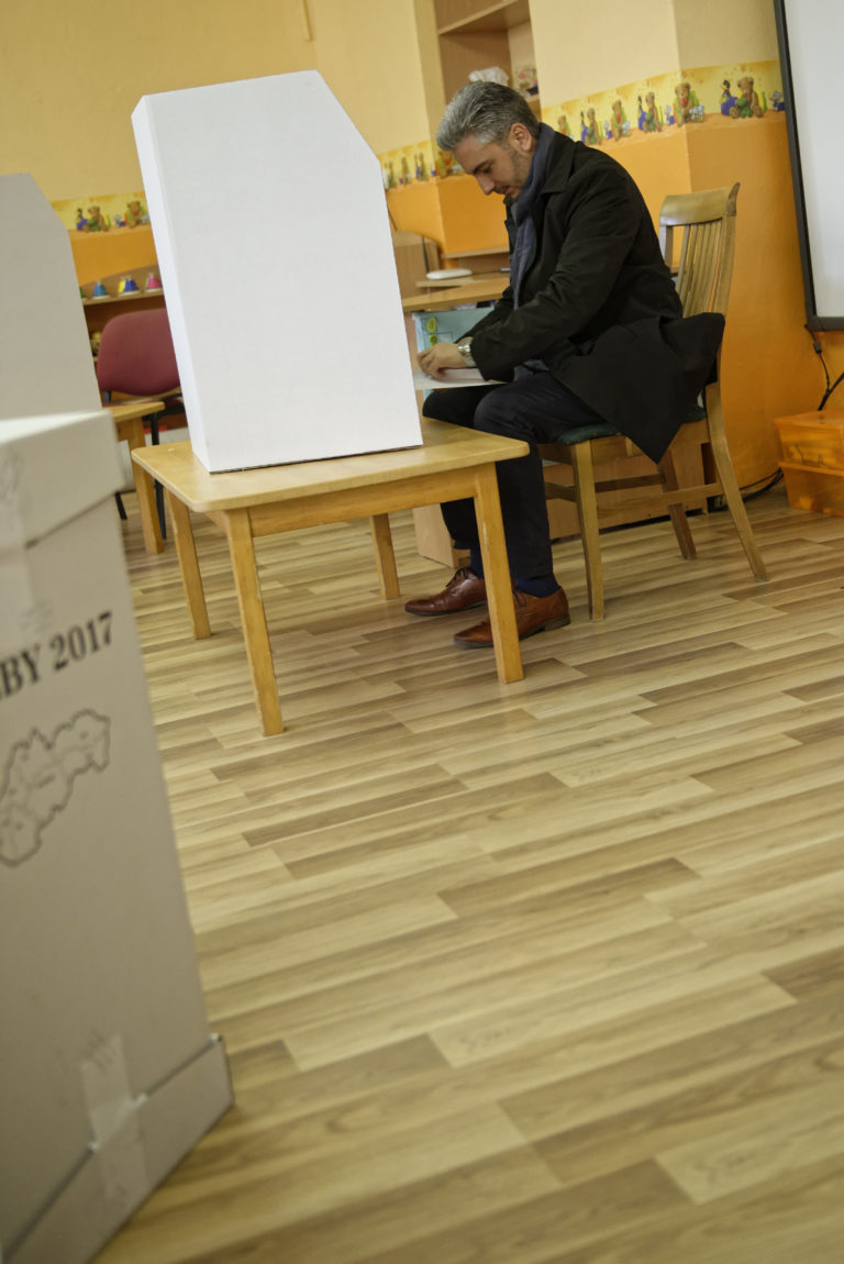 Súčasný predseda PSK a kandidát na post predsedu PSK Peter Chudík (vľavo) počas volebného aktu v rámci volieb poslancov a predsedov do orgánov samosprávnych krajov - vyšších územných celkov (VÚC) v Prešovskom samosprávnom kraji (PSK). Záborské, 4. november 2017. Foto. SITA/Viktor Zamborský