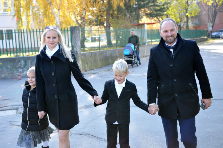 Kandidát na post predsedu Trnavského samosprávneho kraja (TTSK) Jozef Viskupič (vpravo) s rodinou počas volieb poslancov a predsedov do orgánov samosprávnych krajov - vyšších územných celkov (VÚC) v Trnavskom samosprávnom kraji (TTSK). Trnava, 4. november 2017. Foto: SITA/Ivan Kopčáni