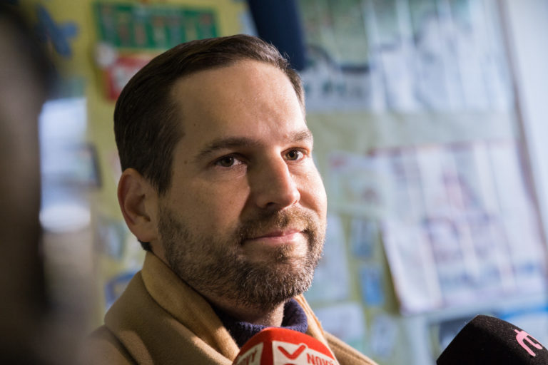 Starosta mestskej časti Nové Mesto a kandidát na post predsedu Bratislavského samosprávneho kraja (BSK) Rudolf Kusý odpovedá na otázky médiám počas volieb poslancov a predsedov do orgánov samosprávnych krajov - vyšších územných celkov (VÚC) v BSK. Bratislava, 4. novembra 2017. Foto SITA/Branislav Bibel