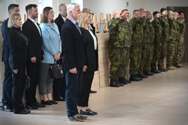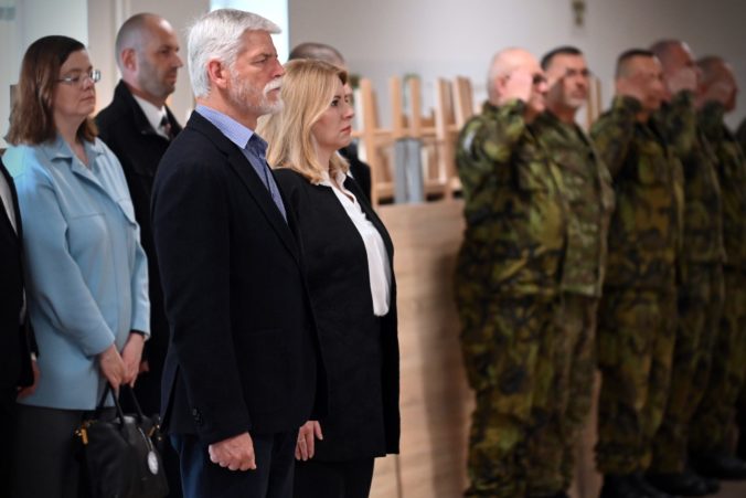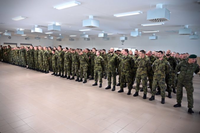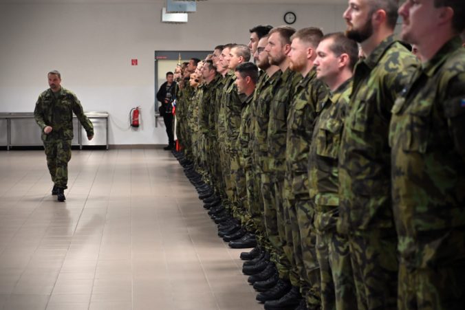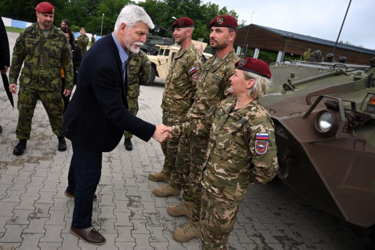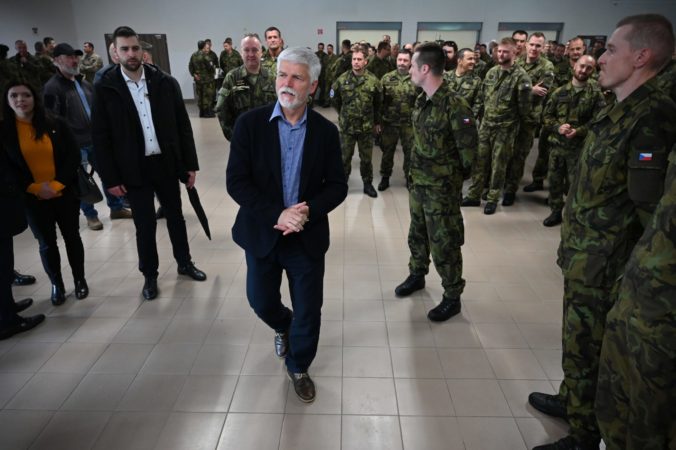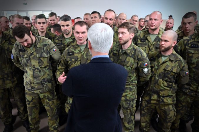 Petr Pavel počas stretnutia s príslušníkmi medzinárodnej bojovej skupiny NATO, ktorá v Lešti pôsobí od minulého roka pod velením českých vojakov pri príležitosti spoločnej návštevy prezidentov Slovenskej republiky a Českej republiky v Centre výcviku Lešť. Foto: SITA/Jakub Julény.