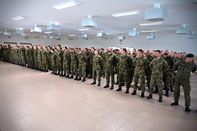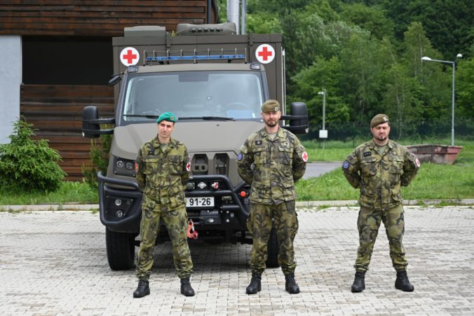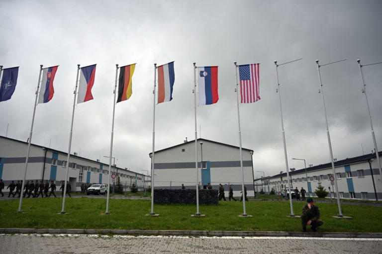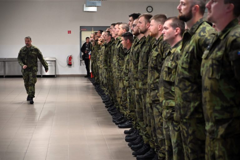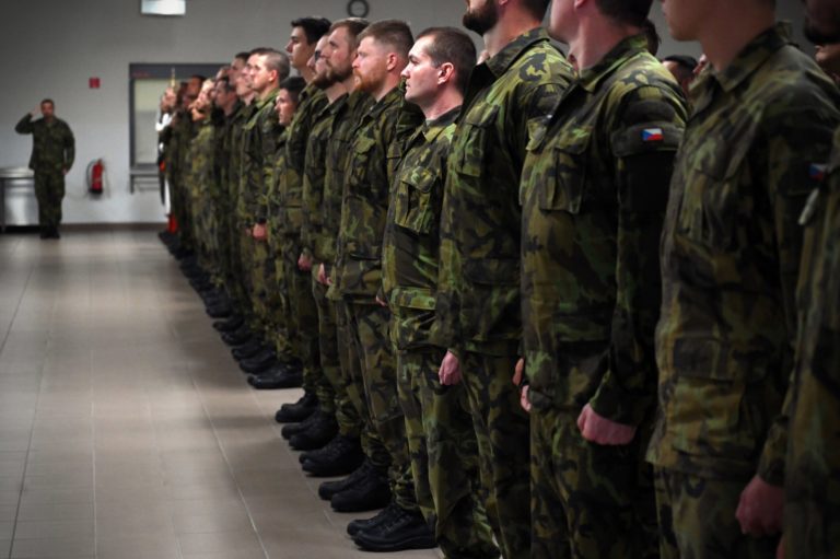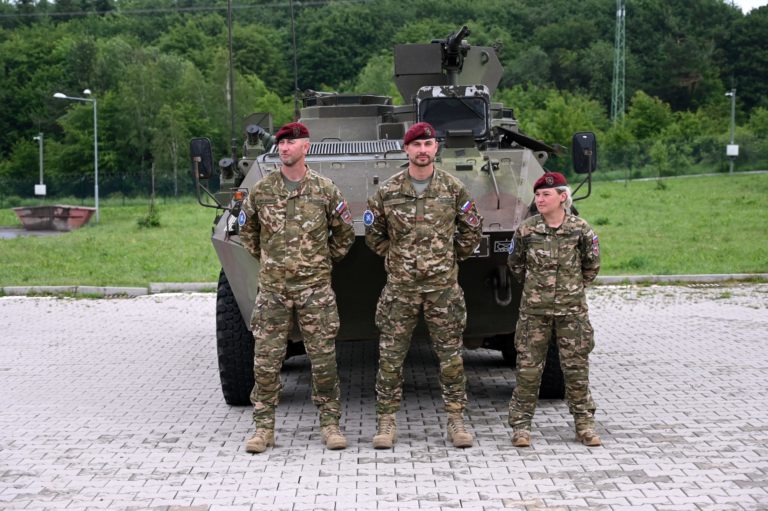 Príslušníci medzinárodnej bojovej skupiny NATO, ktorá v Lešti pôsobí od minulého roka pod velením českých vojakov pri príležitosti spoločnej návštevy prezidentov Slovenskej republiky a Českej republiky v Centre výcviku Lešť. Lešť, 7. Jún 2023. Foto: SITA/Jakub Julény.