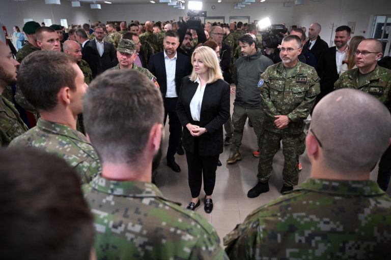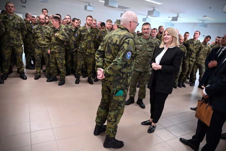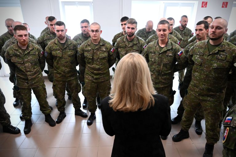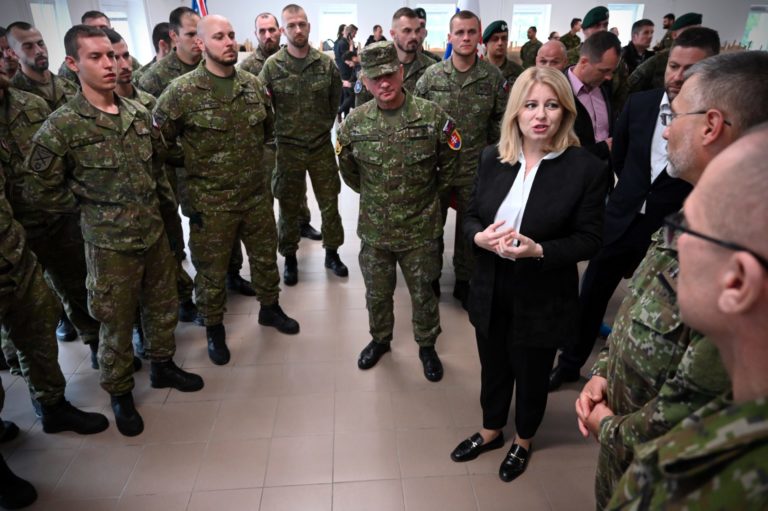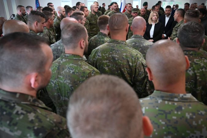 Prezidentka Slovenska Zuzana Čaputová počas stretnutia s príslušníkmi medzinárodnej bojovej skupiny NATO, ktorá v Lešti pôsobí od minulého roka pod velením českých vojakov pri príležitosti spoločnej návštevy prezidentov Slovenskej republiky a Českej republiky v Centre výcviku Lešť. Lešť, 7. Jún 2023. Foto: SITA/Jakub Julény.