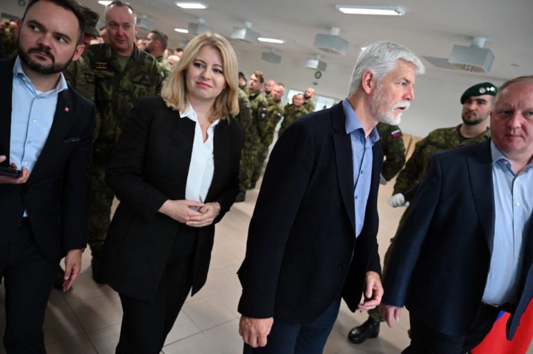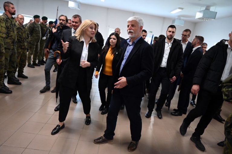 Zuzana Čaputová a Petr Pavel počas stretnutia s príslušníkmi medzinárodnej bojovej skupiny NATO, ktorá v Lešti pôsobí od minulého roka pod velením českých vojakov pri príležitosti spoločnej návštevy prezidentov Slovenskej republiky a Českej republiky v Centre výcviku Lešť. Lešť, 7. Jún 2023. Foto: SITA/Jakub Julény.