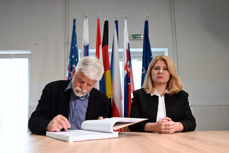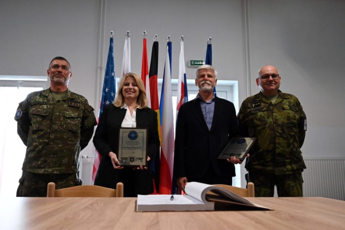 Zľava: Zástupca veľiteľa medzinárodnej bojovej skupiny NATO Alexander Schober, Zuzana Čaputová, Petr Pavel a veľiteľ medzinárodnej bojovej skupiny NATO Karel Navrátil počas stretnutia s príslušníkmi medzinárodnej bojovej skupiny NATO, ktorá v Lešti pôsobí od minulého roka pod velením českých vojakov pri príležitosti spoločnej návštevy prezidentov Slovenskej republiky a Českej republiky v Centre výcviku Lešť. Lešť, 7. Jún 2023. Foto: SITA/Jakub Julény.