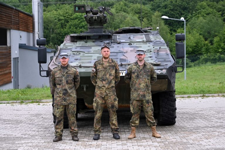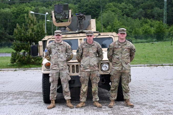 Príslušníci medzinárodnej bojovej skupiny NATO, ktorá v Lešti pôsobí od minulého roka pod velením českých vojakov počas spoločnej návštevy hlavy štátov SR a ČR. Lešť, 7. Jún 2023. Foto: SITA/ Jakub Julény.