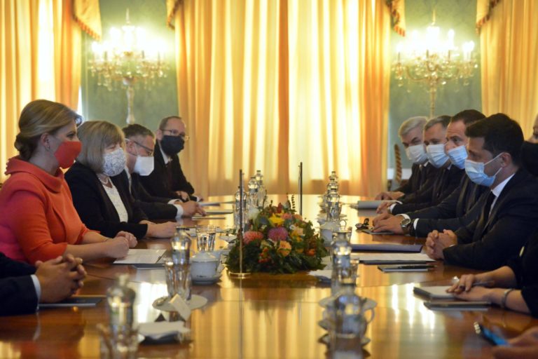 Atmosféra v Zelenom salóne počas rokovania prezidentky SR a prezidenta Ukrajiny s delegáciami v Prezidentskom paláci v rámci návštevy ukrajinského prezidenta na Slovensku. Bratislava, 24. september 2020. Foto: SITA/Jakub Julény