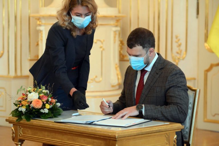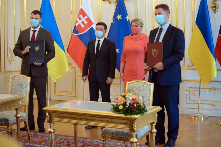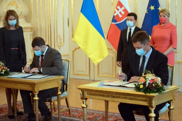 Minister infraštruktúry Ukrajiny Vladyslav Kryklij (vpravo) počas podpisu bilaterálnych dohôd medzi Slovenskom a Ukrajinou za účasti prezidentky SR a prezidenta Ukrajiny v rámci návštevy ukrajinského prezidenta na Slovensku. Bratislava, 24. september 2020. Foto: SITA/Jakub Julény