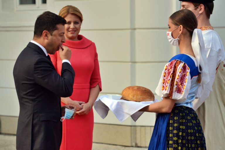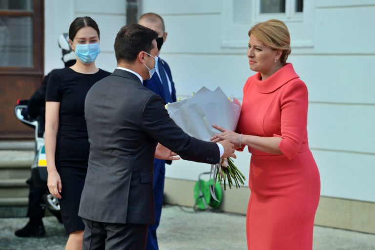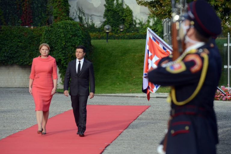 Zľava: Prezidentka SR Zuzana Čaputová a prezident Ukrajiny Volodymyr Zelensky počas oficiálneho privitácieho ceremoniálu v rámci návštevy ukrajinského prezidenta na Slovensku. Bratislava, 24. september 2020. Foto: SITA/Jakub Julény